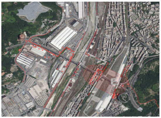 The ‘red zone’ that was totally blocked after the collapse. Red points are the residents and industrial owners without any vehicular accessibility to their properties. (source: http://www.commissario.ricostruzione.genova.it, accessed on 29 August 2020).