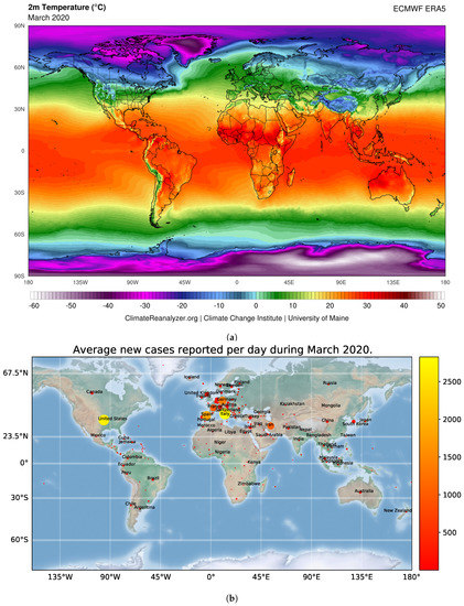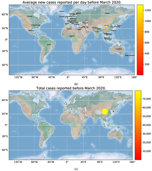 The very first case of COVID-19 was reported during December 2019 in China [1]. Initially, it was expected that the neighboring countries of China may become new epicenters of COVID-19. However, the trend manifested a different behavior. The new epicenters were geographically distant from China yet they shared some similarities, as evident from the heat maps of average temperature shown in Figure 2a and Figure 3a. During February 2020, most of China experienced temperatures in the range from 5–15 °C, as shown by green shading in Figure 2a. To some extent, most of China experienced similar temperatures during March 2020, as evident from Figure 3a. Geographically close to China, only South Korea and Japan were affected at the initial stage of the COVID-19 outbreak, and these locations experienced temperatures similar to China, as evident from Figure 2a and Figure 3a. Although many outbound flights were from China to Thailand before the lockdown of Wuhan [28], it was not among the highly affected locations during the earlier stage of the outbreak. Thailand experienced comparatively higher temperatures, as shown by orange shading (>20 °C) in Figure 2a and Figure 3a. This suggests that higher temperatures might have reduced the spread rate of COVID-19 during the initial stage of its outbreak in certain locations.