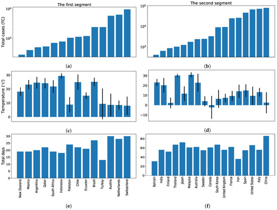 Pattern analysis of COVID-19 pandemic from January to March 2020 for selected locations by comparing TC, mean of temperature, and the number of total days since the very first case reported in each location. (a,b) The TC reported per location. (c,d) The mean and twice of standard deviation of temperature per location. (e,f) The number of total days.