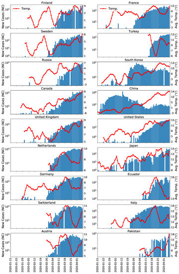 In Stage IV, we analyzed the trends of NC reported per day and average temperature for the past 7 days, for selected locations, by bearing in mind the measures taken in the locations to contain the virus. The trends are depicted in Figure 6 and Figure 7 separately for each location wherein the bar plot denotes the number of NC reported per day and the line plot denotes the average temperature for the past 7 days. It should be noted that the locations in Figure 6 and Figure 7 are organized in ascending order according to the maximum average temperature. For example, the maximum average temperature for Finland was around 4 °C and, for Sweden, it was around 6 °C. Starting from Russia in Figure 6 up to Spain in Figure 7, excluding Japan and Ecuador, the rest of the locations reported more than 1000 NC per day. On the other hand, excluding Brazil, the locations before Russia in Figure 6 and after Spain in Figure 7 reported fewer than 1000 NC per day. Thus, the pattern is suggesting that the rate of spread of the virus was slower in the regions that experienced either higher or lower temperatures. Furthermore, since the locations around the globe opted for different measures in order to reduce the spread of COVID-19, a clear relationship between average temperature and NC reported per day may not be evident from Figure 6 and Figure 7.