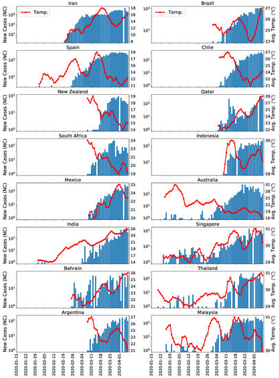 Japan reported a smaller number of NC during the earlier stage of the outbreak because the population routinely makes use of masks which reduced the rate of the spread of the virus. Furthermore, New Zealand reported its first case during the first week of March 2020, and experienced temperatures above 20 °C, as evident from Figure 6. However, New Zealand called for a lockdown at an earlier stage of the outbreak, on 25 March 2020, by predicting the rapid growth of the virus in the region. This explains why the rate of spread of the disease came under control in New Zealand. Moreover, the trends of Argentina and South Africa (see Figure 7) are also similar to that of New Zealand (see Figure 6) since South Africa and Argentina also called for a lockdown at an earlier stage of the outbreak, i.e., around 20 March 2020. Although Chile and Brazil also reported their first case in the same period as South Africa and Argentina, the NC reported per day started increasing in these locations since proper measures were not put in place at an earlier stage of the outbreak.