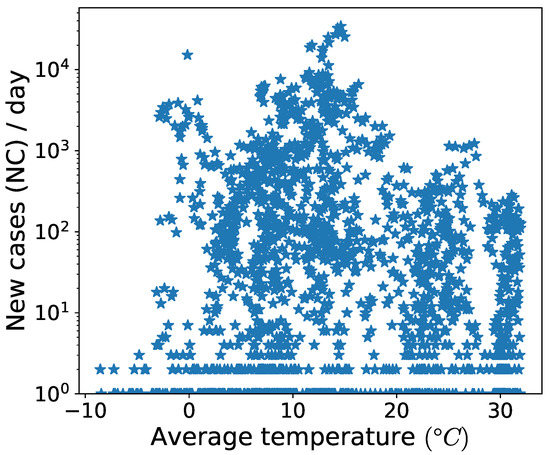After observing the reported trends for 34 different locations, it can be said that the variations in regional temperatures affected the rate of the spread of the COVID-19 pandemic during the earlier stage of the outbreak. However, due to different measures taken in the locations in order to reduce the spread of the pandemic, the patterns observed for each location differ. This could be a reason behind the contradicting findings reported in the existing literature regarding the impact of temperature on the spread rate of the pandemic [4]. Therefore, for further clarity, in Figure 8, we present the scatter plot of NC reported per day in each location against the average temperature. It is evident from Figure 8 that some of the locations experiencing average temperatures in the moderate range (5–20 °C) reported more than 10,000 NC per day. On the other hand, most of the locations with average temperatures above 20 °C or below 5 °C reported fewer than 1000 NC per day. Hence, there is a consistency in the results reported in this section, that is, the locations experiencing temperatures in the moderate range reported, on average, a larger number of cases.