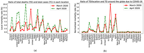 In Stage V, we analyzed two different patterns for the mortality rate of COVID-19 for the selected locations considered in Stage IV. The first pattern was obtained by taking the ratio of TD and TC reported by each location and the results are depicted in Figure 9a. This pattern gives insight into the mortality rate of COVID-19 in each location. The second pattern was obtained by taking the ratio of TD per location to TD reported around the globe, and the results are depicted in Figure 9b. This pattern gives a global view of mortality due to the pandemic. Figure 9a,b show the two patterns for selected locations for March and April 2020. Since most of the locations called for a lockdown during the third and fourth week of March 2020, it was important to analyze the mortality patterns after two to three weeks of the lockdown.