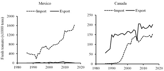 The tomato industry in Florida is suffering due to the import pressure from Mexico and the loss of farmland due to real estate development. The North American Free Trade Agreement (NAFTA) between the United States, Mexico, and Canada came into force on 1 January 1994. Tomato production in Florida decreased by almost 50% from 1991 to 2017, while the import volume increased almost fivefold (Figure 4).