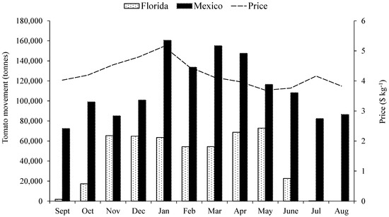 Monthly price and movement of tomatoes in Florida and Mexico during the 2018 production season (Source: USDA-AMS, USBLS).