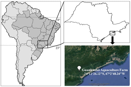 Data were collected in the hatchery of D. iguape placed at the Guanhanhã Municipal Aquaculture Farm (24°12′26.12″ S, 47°2′48.24″ W) (Figure 1), located within the Sea Mountains State Park, Itariru nucleus, São Paulo State, Brazil. The analyses of the environmental, social, and economic sustainability were carried out using the set of indicators developed by Valenti et al. []. The mathematical principles and formulae to calculate each indicator are described in that article [], and, therefore, they are not repeated in this study.
