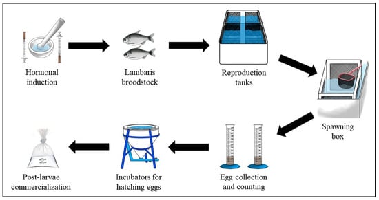 The procedures described below (Figure 2) are regularly performed at the Guanhanhã Municipal Aquaculture Farm and can be easily adapted to any hatchery. The site has two 100 m2 earthen ponds to maintain a broodstock of about 2000 fish, and three 1000 L tanks, with four spawning boxes inside each one. Sixty females and 120 males were collected in the advanced maturation stage in the earthen ponds and transferred to the laboratory. Five females were stocked in each of the 12 spawning boxes. The temperature was maintained between 25 °C and 27 °C, and an aerator was used to keep the dissolved oxygen stable and close to the saturation value. The males remained in a separate tank with aeration and temperature around 25 °C.