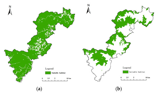 Suitable habitat distribution for Elliot’s Pheasant and Black Muntjac. (a) Suitable habitat for Elliot’s Pheasant (b) Suitable habitat for Black Muntjac.
