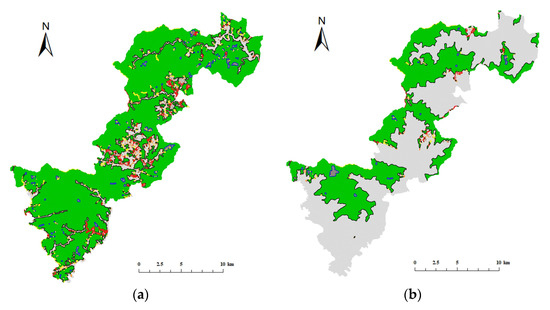 Morphological spatial pattern analysis of Qianjiangyuan National Park. (a) MSPA results for Elliot’s Pheasant (b) MSPA results for Black-fronted Muntjac.