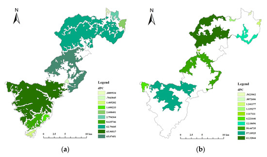 The core area from the morphological spatial pattern analysis was extracted, and the top 30 patches were selected in descending order according to the size of the area to generate the node files and link files required for the connectivity probability calculation, with different dispersal distances considered in the calculation (Elliot’s Pheasant = 3 km, Black Muntjac = 5 km). The delta of the probability of connectivity (dPC) for the 30 core patches was calculated using Conefor Sensinode2.6 software (http://www.conefor.org/) (accessed on 21 May 2021) (Table 5). The top 10 patches with dPC values were selected as key habitats to obtain a map of key habitats importance ranking (Figure 7).