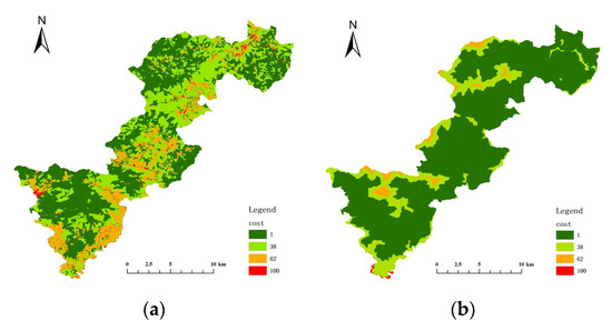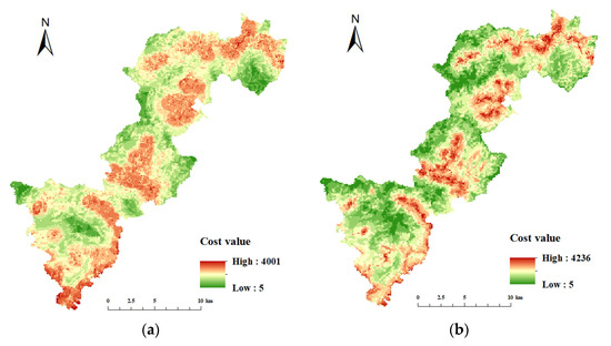 Cost raster maps of Elliot’s Pheasant and the Black Muntjac in Qianjiangyuan National Park. (a) Cost raster of Elliot’s Pheasant (b) Cost raster of the Black Muntjac.