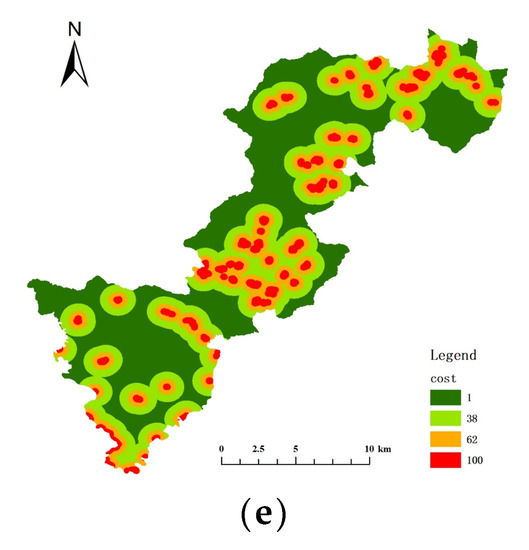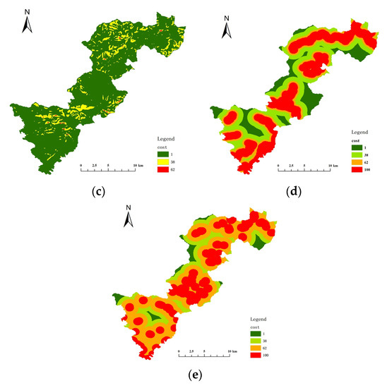 Cost surface of each resistance indicator for Elliot’s Pheasant. (a) Cost of vegetation (b) Cost of elevation (c) Cost of slope (d) Cost of distance from road (e) Cost of distance from residential areas.