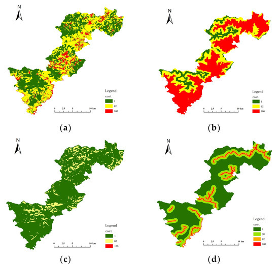Each pair of key habitats can be connected to each other by a least-cost path based on a least-cost model [6]. Least-cost paths are often used to optimize grid modules [30], and the grid’s resistance value describes its facilitating or hindering effect on species dispersal processes. Resistance values are attached to each land cover cell to calculate the connectivity between two habitats [43]. Therefore, using cost-path analysis in ArcGIS to calculate the path of least resistance for organisms moving along key habitat patches, potential corridors between key habitats can be obtained.