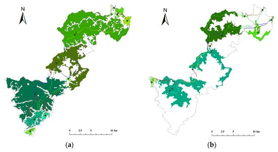 Distribution of key habitats and potential corridors in Qianjiangyuan National Park. (a) Elliot’s Pheasant (b) Black Muntjac.