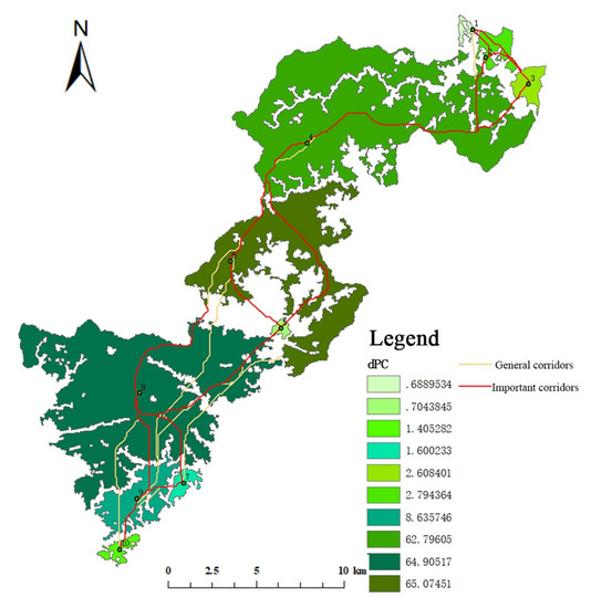 The probability of connectivity (PC) is an area-based functional connectivity method that is well suited to identify key elements that maintain overall habitat connectivity to quantitatively describe landscape connectivity and identify patches with important connectivity [41]. The delta of PC (dPC) can be used to calculate the contribution of each patch to the overall connectivity of the ecological network. The formula for the calculation is as follows: