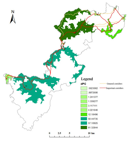 where and refer to the area of habitat i and j, respectively; the strength of the connection between any pair of patches is denoted by , which describes the ease of dispersion between patches i and j; and AL refers to area of the national park. Conefor Sensinode 2.6 software (http://www.conefor.org/) (accessed on 21 May 2021) was used to calculate dPC values. According to the different dispersal abilities of the target species, the dispersal distance thresholds were set at 3.0 km and 5.0 km for Elliot’s Pheasant and the Black Muntjac, respectively. If the distance between two patches was within the threshold, we set 0.5 as the probability of dispersion between patches [42]. Finally, the top 10 patches with the highest dPC values were selected as key habitats.