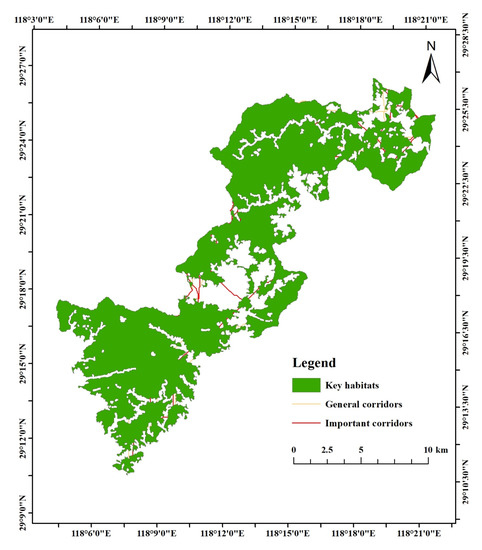 In this study, we constructed an interaction matrix between 10 key habitats based on the gravity model, and corridors with an interaction force greater than 0.1 were extracted according to the matrix evaluation results as important corridors, with the rest designated as general corridors. The general corridors, important corridors and key habitats were superimposed to construct a network of key habitats and corridors in Qianjiangyuan National Park.