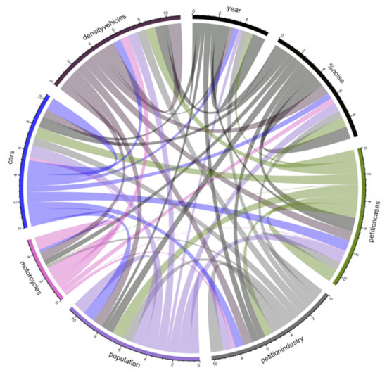 Figure 1 represents the connections between various entities known as nodes and it can be seen that there is a significant connection between vehicles, connecting motorcycles and cars to the number of petitions. A label on the outer part of the circular layout represents each entity. There are significant differences, especially for the number of noise pollution disturbance petitions due to industrial activity. The highest correlation value between petition cases and the population is (0.95). It means that the people of Taiwan are very active in giving their opinion to the government. In addition, the correlation value between the population and the petitioning industry of (0.71). In represents, people who live in the manufacturing industry area and its surroundings also have active participation in reporting on noise pollution. This study also highlighted that all percentage noise values have negative values such as petition cases (−0.78), petition industry (−0.56), motorcycles (−0.43), cars (−0.49), and density vehicles (−0.75), respectively. All things considered during the COVID-19 pandemic there was a reduction in activity by the local people in Taiwan.
