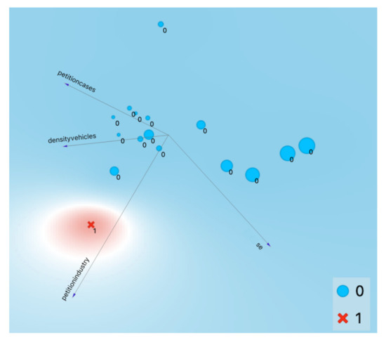 Figure 2 explains the linear projection with the labels before COVID-19 (0) and during COVID-19 (1). It is clear that there are differences in projection values, especially for the number of industrial petitions. The number of reports of discomfort due to noise pollution decreased during the COVID-19 pandemic. However, during the first month of COVID-19, most of industrial businesses temporarily closed. In addition, industrial noise control was carried out to prevent industrial noise and protect workers from the harmful effects of high-intensity noise exposure. Covering frequency components (partial or complete acoustic enclosure), acoustic barriers, noise shielding and noise lagging are some commonly implemented procedures. In addition, noise control can also be implemented administratively by regulating work patterns. A final measure is the use of personal protective equipment to reduce noise, such as earplugs and ear protection. All the statistical analyses proved there was a significant difference in noise pollution before and during COVID-19. However, during COVID-19, the Taiwan government’s policy and response was that no lockdown would be implemented [47]. Taiwan’s COVID-19 control has been a great accomplishment, mostly due to early moves to observe incoming travelers from Wuhan, China, and strict regulations for lockdown and facemasks. There was no lockdown in the nation and fewer than 1027 cases were recorded in April 2021.