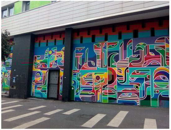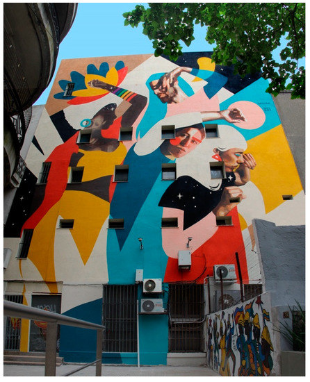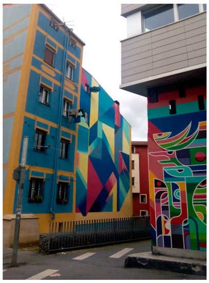 Due to the absorption of mural painting, and especially of urban art, into the art market and its growing acceptance by institutions, mural painting and urban art festivals, together with art, urban design, restoration, and the construction of emblematic buildings and cultural infrastructures, are now used as vehicles for urban regeneration in degraded areas of large cities [23], turning them into creative and cultural districts and distinctive urban brands [24]. The beginnings of this type of model of urban reconstruction can be found in historic centers, such as Lavapies and Malasaña in Madrid, Ciudad Vieja in Montevideo, Bilbao la Vieja in Bilbao (Figure 1 and Figure 2), Shoreditch in London [25], Bushwick in Brooklyn, and Alfama in Lisbon [26].