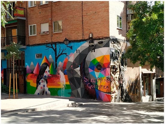 On the other hand, these new economic and business models attract a new type of audience/client, becoming an attraction and an opportunity for sectors with greater purchasing power, such as the so-called creative class, which can trigger changes in the socio-economic structure of the place [36]. It is, therefore, important to highlight the role that public organizations play in the sustainable management of urban environments with the arrival of new opportunities and the revaluation of public land [37]. This can cause gentrification processes in these areas, which convert them into new market domains [38], thus, modifying the traditional economic and commercial activities of these neighborhoods. Land revaluation and speculation is one of the most problematic factors that can occur, with serious consequences for residents belonging to the poorest sectors of the population. There is an increase in the cost of housing and rent, and with this, an increase in prices in general. Thus, the most vulnerable social groups, who tend to be the majority in these particular urban districts, find it impossible to continue living there, forcing them to leave in search of more affordable residential areas. This is also the case with traditional businesses, which find it difficult to survive [27,36]. In addition, there is the new problem of holiday rental apartments, where the purchase of buildings by large private investment funds is frequent, leading to the tenants being forced out as they are not able to pay the increased cost of rent. An example of this situation can be seen in the Madrid neighborhood of Lavapies, where the beautification of the neighborhood through murals was initially welcomed positively by residents. However, land speculation and the overcrowding generated by holiday rental apartments and tourists have made the local community come out in protest against the negative effects that the changes in the neighborhood have brought [31]. This has led to some wall paintings being vandalized, including the mural painted by Okuda (Figure 4), one of the most famous international urban artists, becoming another element in the development of gentrification [39]. Therefore, policies need to be developed from a cross-cutting perspective, taking into account urban, social, cultural, economic, and tourist factors, to prevent mass displacement of certain social groups and the loss of these neighborhoods’ identity [40].