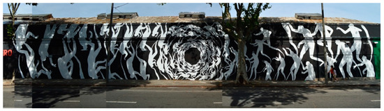 One of the first cases of gentrification in Uruguay took place in 1995 when Colonia del Sacramento was named a World Heritage City. The historic center suffered a loss of identity and mass displacement of its residents due to the purchase of buildings by foreign private investors, whose sole objective was to convert the emblematic houses in the south district into hotels and restaurants for the exponential arrival of mass tourism [43]. Another more recent example occurred in the current process of reconversion of the neighborhood of Ciudad Vieja in Montevideo. This district is located in the historic center of the city, next to the port, and is popular with cruise tourists. It is characterized by being a “red zone” and is inhabited by very vulnerable social groups. At the “Urban Extractivism and Gentrification” discussion group, organized by the Montevideo City Council, several testimonies were collected that reflected this issue. One participant spoke directly about how a private urban revitalization project called “El Bajo” was carried out in a very degraded area of the neighborhood. It focused on showcasing Ciudad Vieja as a cultural circuit through the organization of different urban art, theatre, music, and cinema exhibitions [46]. Within the renovation of the neighborhood and following the steps of the MUTA Montevideo project conducted in the Goes neighborhood in 2013, which will be discussed later, the 1st Casa Wang Urban Art Festival was created in 2015. This event was organized by a group of the same name, Colectivo Casa Wang, which includes the most relevant emerging artists on the Uruguayan urban scene, such as David de la Mano (Figure 5), Zësar Bahamonte, Noel, Nulo, Ákite, Pablo Machioli, and Ceci Ro (Figure 6), who painted different walls. These types of actions that develop public spaces have had an impact on the arrival of foreign tourists and, with it, private investment, gradually increasing the price of land and, thus, affecting the resident community [47].