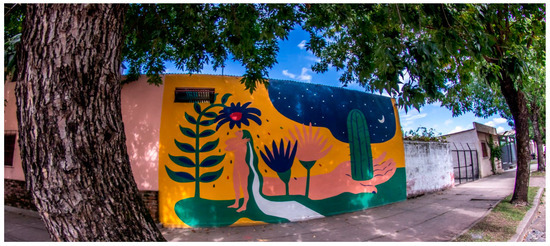 In a similar vein to the urban art festival format, in subsequent years, several groups of urban artists organized other mass mural painting experiences, using them as a tool to revitalize degraded urban environments, focusing on rural enclaves. One of the most prominent was the one carried out by the Pintó Collective in Dolores in 2015, which was jumpstarted after severe flood episodes. On this occasion, the artists showed solidarity with the citizens and altruistically painted walls and facades for three days. Due to the positive acceptance by the community, and realizing the ability of mural painting to generate new tourist products, the “Paseo de los Murales” mural route was created through the “Coexistence” event, in which murals featured nature and local heritage themes. At government level, the initiative has been promoted as a new tourist attraction in the town [50]. Other urban art circuits that have become a pull for cultural tourism include the rural settings of Villa Soriano, promoted by the Vatelón Residence, and Mercedes, through the two 33 Degrees Urban Art Festival held in 2019 (Figure 7) and 2020.