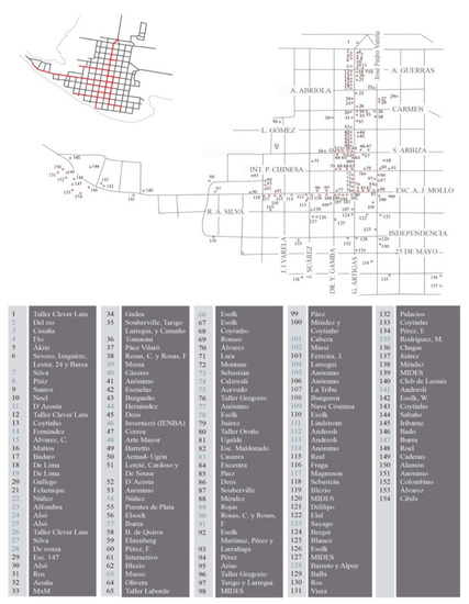 Until that time, a large number of the mural paintings in Uruguay were totally linked to “high culture”. Thus, in the decade of the 30s, muralism was framed within the plastic movements of social realism and included works by artists such as Norberto Berdia, Demetrio Urruchúa, Esteban Garino, Luis Mazzey, Carlos González, and Felipe Seade [51]. In constructive universalism, the salient works were carried out by Joaquín Torres García and TTG students, including Augusto Torres, Horacio Torres, Francisco Matto, Edwin Studer, José Gurvich, Julio Uruguay Alpuy, and Dumas Oroño. In the 1950s, the mural aspect was linked to the abstraction movement, with Miguel Ángel Pareja as a key actor, promoting the mosaic technique both inside and outside the National School of Fine Arts [52]. In the decade of the 60s and 70s, the movement disassociated itself from high culture, although it continues to be developed within the scope of the National School of Fine Arts through university activities, such as the “visual awareness campaigns” and the “mural painting campaigns” [30,53].