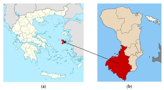 (a). Map of location of Chios island. Source: https://en.wikipedia.org/wiki/Chios#/media/File:Greece_location_map.svg, accessed on 24 February 2021 (modified by Paraskevopoulou), and (b) Mastihochoria area on Chios island. Source: https://en.wikipedia.org/wiki/Mastichochoria#/media/File:DE_Mastichochorion.svg, accessed on 24 February 2021 (modified by Paraskevopoulou).
