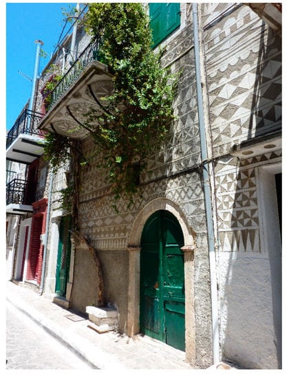 Typical house facade at Pyrgi, a traditional settlement of Mastihohoria, Chios island, Greece. source: A. Paraskevopoulou.