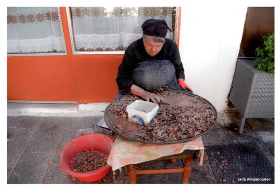 Culture: Masticulture is a family occupation, with the cultivation, collection, and processing of mastiha following an annual cycle [25]. The average amount of resin produced per mastic tree is 100 g [35]. Every year, during January–February, the lower branches of the mastic trees are removed and the trees are fertilized. In June, the soil surface on which the mastiha will drop and be collected is prepared. Initially, the soil around the tree trunk is levelled and cleared of weeds and leaves. Following, the soil surface is swept using “frokalies” (i.e., brooms made from branches and leaves of plants such as weaver’s broom, thyme or the mastic tree) and then hand-spread with “asprohoma” (white earth containing calcium carbonate) (Figure 4). In mid-July, the “kentos” commences, which involves making small incisions on the truck and main branches of the mastic tree using a sharp tool called a “kentistiri”. The mastic drips from the tree and gradually, after approximately 15–20 days, solidifies into a crystallized form [36]. The first mastiha harvest starts when the largest pieces of crystallized mastic drop, and takes place after the 15 August [36]. Following the first harvest, a second “kentos” and harvest is performed (mid-September—mid-October) [36]. The harvested mastic is washed either with seawater [25] or natural spring water [36], placed in wooden boxes and stored in a cool place. Elderly women in small groups carefully clean the mastic using sharp tools to remove any impurities [36,37] (Figure 5) and finally hand over the cleaned mastic to the Chios Mastiha Growers Association, where it will be sorted, classified and graded depending on the color and size of the mastic drops [38].