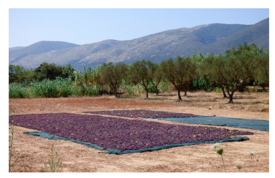 Culture: The black raisin from Aigialeia, known as vostitsa, has received a Protected Designation of Origin (PDO) [40], whose specifications include most of the traditional farming techniques used in the area. These techniques are mostly done by hand with the help of peaks or scissors, rake-brooms (gravalo), brooms (saromatina), and machines that separate the raisin from foreign materials and separate the different sizes of grapes (makina). Black raisin cultivation involves soil digging, pruning, tilling, preparation of the threshing floors, harvest (collection of grapes from the vines) and drying (Figure 8) [37]. The raisin cultivator’s family participates in all the works mentioned above, especially during the period after the harvest, when the cultivators need to live in small houses located inside the raisin fields, also known as “lina”. During the harvest period, the areas where “lina” are located, and the nearby villages as well, come to life. On top of that, during this time, many notable rituals and festivals take place, mostly regarding viticulture activities, such as the celebration of St. Trifonas in February, which concurs with the start of the vine harvest, as well as the celebration of the Metamorphosis of Christ, just before the raisin collection starts [39]. The raisin cultivation in the area has been playing a significant role in the daily life of the raisin-producing communities for centuries, while at the same time they have shaped the cultural landscape. The cultivation of the black raisin has been passed on from generation to generation, and it consists of an important aspect of sustainable development. Despite the decrease in the number of farmers, this tradition is ongoing, due to the efforts of the Farmer’s Union Vostizza. The “secrets” of the raisin cultivation are passed down to younger generations, either verbally or empirically, and the black (Corinthian) raisin has continued to leave its mark (architectural, cultural, developmental, social, gastronomical, and natural) for many centuries, in all the areas it is being cultivated [39].