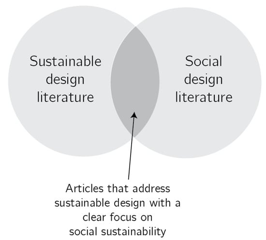 To examine existing knowledge on D4SS, a number of initial search terms were identified related to design, social sustainability, and similar terms. Literature was gathered using Scopus and Google Scholar, with the following searches: “social sustainability” AND “design”; “design for social sustainability”; “socially sustainable design”; “design for social impact”; “design for sustainable social impact”; “design for sustainable social change”. As this resulted in only a small number of articles, it was also decided to expand the literature to include search terms from the domains of social design and sustainable design, including: “socially useful design”; “socially responsible design”; “sustainable product design”; “universal design”; and “inclusive design”. The aim of these searches was to look for literature at the intersection of these domains that considered design and social sustainability (see Figure 1). All articles were examined up until March 2019. When using Google Scholar, the first two pages for each search were retrieved for screening. This resulted in a total of 787 articles for review.