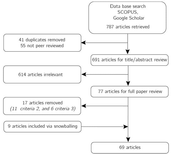 An initial review of titles and, if necessary, abstracts was used to determine relevant papers. This resulted in the exclusion of 710 articles (41 were duplicates, 55 were not peer reviewed and 614 were irrelevant). This left 77 articles for full paper review. At full paper review, 17 papers were removed as 11 papers were not relevant to social sustainability, and six papers were not relevant to product-service system design. This resulted in a total of 60 papers that met the criteria identified. A further nine papers were identified using snowballing, resulting in a total of 69 papers. Upon reviewing the papers, a decision was made to include two papers related to urban design despite the initial inclusion/exclusion criteria. These papers were highly cited and cited among other papers that met the criteria. Furthermore, one book chapter [] was included from an author whose papers were separately identified as making key contributions. Although this item did not meet the initial criterion for a peer-review journal, it was deemed significant due to the fact it was highly cited and reference by other papers. See Figure 2 for an overview of this review process.