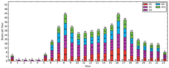 The GTFS data feeds were collected from the Metropolitan Transportation Authority (MTA) to represent the MTA NYC bus routes and stops. The data package contains eight text files: Trips, stops, stop times, shapes, routes, calendar dates, calendar, and agency. Open-source Python 2.7.13, an interpreted object-oriented, high-level programming language, was used to visualize GTFS data, focusing on MN bus transit into Static Data Feeds (GTFS Schedule Data). Lines in this layer represent individual bus routes that follow the route’s physical locations. They were generalized from the GTFS format, where lines depicted individual services. Please refer to Correa et al. [34] for more details on GTFS transit data. Figure 2 shows the number of buses from bus lines M1, M2, M3, M4, and M72 arriving at bus stop # 400,124 5 AV/E 72 ST by each hour.