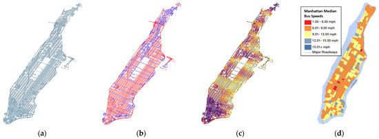 Study area: Manhattan Borough in New York City. Network Data Visualization, (a) network contains nodes for road intersections and joints; (b) network provides the single way in red and double way in blue; (c) M22 bus network busiest nodes visualized from low (dark violet) to high (light yellow); (d) median bus Speeds of Manhattan.