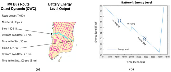 A battery (capacity size of 60 kWh) simulation for the M8 bus route in Figure 7a is shown in Figure 7b. The energy level is within the upper and lower limits. We assume that the energy capacity of the battery is linearly proportional to the cost of the battery. This assumption is realistic, as an EV battery pack contains multiple battery cells, so the capacity is defined by the number of cells included in the battery pack. This method of linear cost calculation is also widely used in the industry.