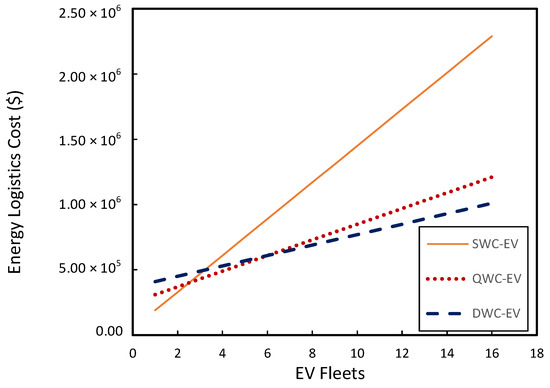 As shown in Figure 8, the cost lines for SWC-QWC and QWC-DWC cross when the number of vehicles is three and seven, respectively. This means that if there are less than three cars, SWC is the most economical and if the number of EVs is between three and seven, QWC is competitive. If the number of vehicles is more significant than seven, DWC is the most efficient and economical. The lines with lower costs SWC for fleet < 3, QWC for 3 < fleet < 7, and DWC for fleet > 7, regardless of the charging type, should be considered the lower bound for the wireless charging EV.