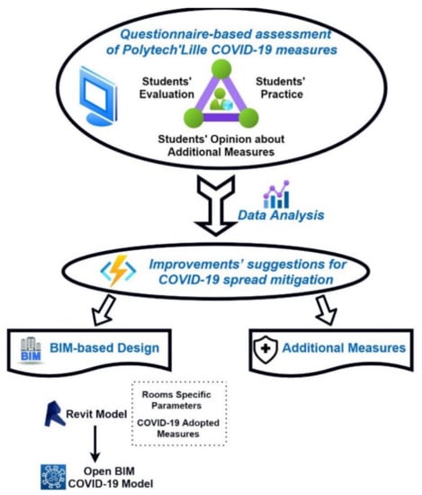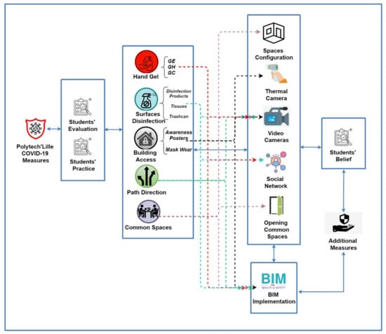 This paper presents a comprehensive methodology for evaluating and improving the anti-Coronavirus (COVID-19) measures in higher education establishments. The methodology combines the use of: (1) Building Information Modeling (BIM) for the integration and control in a 3D graphic environment the anti-COVID-19 safety measures; (2) a questionnaire to collect the students’ commitment to safety measures and their suggestions to improve these measures; (3) data analysis to explore the impact of the students’ profiles on their commitment to safety measures. The proposed methodology is applied at the engineering school Polytech’Lille in the North of France. Results show that the BIM model provides valuable services to the administration by integrating the safety measures in a 3D environment and checking the compatibility of these measures and their improvement. The use of the questionnaire allows the administration to collect students’ feedback about their commitment to safety measures and their suggestions to improve these measures.