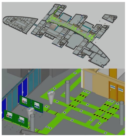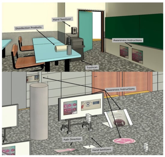 In May 2020, Polytech’Lille implemented the government safety regulations associated with the COVID-19 epidemic. These measures concerned awareness instructions, Building Access (BA) restriction, indoor circulation paths, Closure of Common Spaces (CCS), surfaces disinfection, hand sanitizer services at the entrance, in the hall, and classrooms. The safety measures were added as a COVID-19 layer in the BIM Model. Figure 3 shows the safety measures at the school entrance and in the classrooms as integrated into the BIM model.