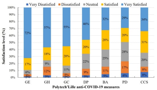 Figure 4 shows the evaluation by the students of the anti-COVID-19 measures, which concern both disinfection and access restrictions. The disinfection measures included the availability of DP, Gel at the Entrance (GE), Gel at the Hall (GH), and Gel in Classrooms (GC). The access measures contained restrictions of the BA, PD, and CCS.