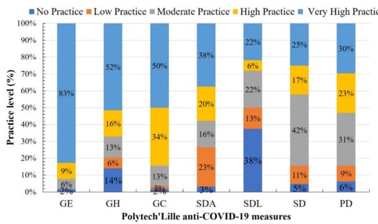 Figure 5 presents a synthesis of the students’ responses. It shows that the highest students’ commitment concerned hand sanitizers (4.29 ± 1.02) followed by distancing measures (3.54 ± 1.16), then surface disinfection (3.14 ± 1.43). The strong commitment (high to very high practice) ranged from 68% to 92%, 28% to 58%, and 42% to 53% for hand sanitizers, surfaces disinfection, and distancing measures, respectively. Distancing measures presented the highest number of students with “moderate practice”. On the other hand, surface disinfection had the highest number of students with “no practice”.