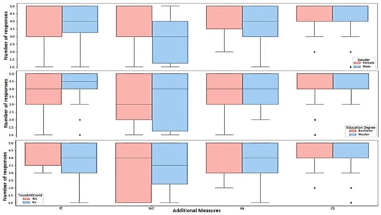 The level of education grouped box plot shows that master’s degree students cared more than bachelor’s degree students about additional measures. The median seemed similar for SN (4) and CS (5) in both degrees, but it differed for SVC and TC. The median weight was more pronounced for SVC (bachelor: 3, master: 4) than TC (bachelor: 4, master: 4.5). This result shows that master’s and bachelor’s degree students had approximately the same judgment about SN and CS. The assessment differed between them for TC and SVC. This was particularly the case for SVC, where the responses were highly scattered among different scales.