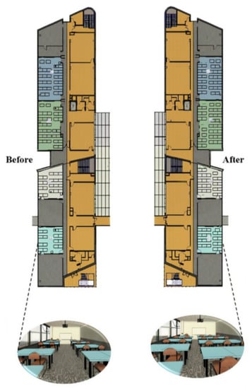 The optimization of the classroom capacity was conducted using the Open BIM COVID-19 (OBC-19) application, which complies with safety COVID-19 regulations stated by governments worldwide []. Table 6 summarizes the results of the use of this application in some classrooms. It could be observed that the capacity of some classrooms could be increased by 30%. Figure 9 illustrates the change in the desk configuration according to the OBC-19 application. The desks were redistributed in a way that respects the SD.