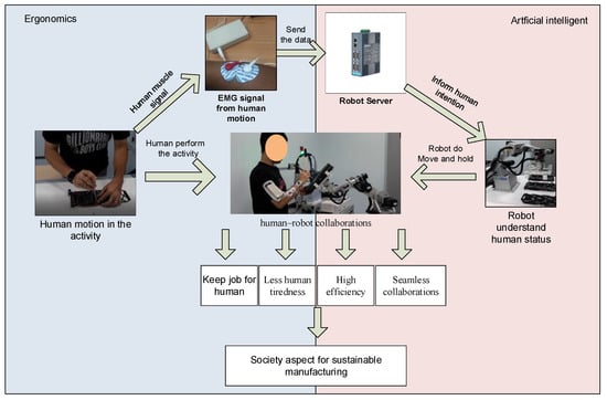 A paradigm shift within modern automated manufacturing system practices has allowed the dominant use of robots. However, this change is in contrast to the principle of sustainability concerns, as stipulated by the manufacturing companies. Sustainable manufacturing focuses on human well-being, which entails various objectives and responsibilities in social aspects of work []. In this case, humans have the dominant role in manufacturing due to their advantages, such as flexibility in their cognitive processes []. Sustainable manufacturing practices conceivably engage with human empowerment in social aspects. In this case, human workers play a pivotal role in manufacturing practices based on the provided advantages. Thus far, it is believed that the adjustment process is significant in maintaining the sustainable application of a modern manufacturing system. Consequently, the collaboration between humans and robots provides an effective attempt to achieve sustainable manufacturing practices. The framework in Figure 1 illustrates the proposed concept of this study, which is related to a collaborative scenario between humans and robots to support sustainable manufacturing practices. The proposed concept in this framework combines two approaches; namely, an ergonomic perspective and artificial intelligence. The ergonomic approach focuses on determining the activities which generate exhaustion in human activities and further support the utilization of robots. The artificial intelligence approach is thus employed to craft the expected collaboration between humans and robots through the classification of human intentions. Henceforth, it is expected that such collaboration could achieve sustainable manufacturing practices by regarding social aspects, such as the human role. This approach is pursued to provide job opportunities for human workers despite the paradigm shift towards automation. Accordingly, this approach is expected to mitigate the exhaustion effect of human activities owing to robot allocation. The proposed approach is additionally expected to achieve work performance efficiency. Since robots are involved to mitigate the exhaustion of human workers, collaboration between the two is predicted to be achieved by applying artificial intelligence based on human muscle signals.