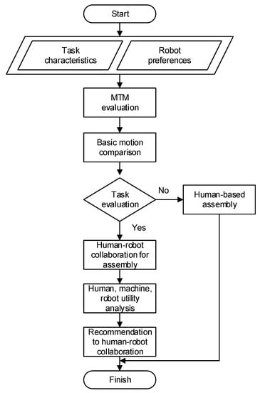 The analysis of the basic motions of an assembly system is the first step of the proposed method for determining the tasks to be allocated to humans and robots. The MTM analysis procedure breaks an activity into basic motions and estimates the standard predetermined time for each motion []. Gilbreth used 18 types of motions in the MTM analysis for classifying human activities. Gilbreth classified the 18 basic movements into effective and ineffective motions based on the motion characteristics, as shown in Table 1 []. The 18 different motions were generated from the analysis of human body movements during the performance of various kinds of work []. The results of this basic motion analysis will provide a new standard operating procedure in human–robot collaboration scenarios. In evaluating which task is to be allocated to the robot, one can consider many factors collected from previous experiences related to the characteristics of motions performed by humans. Figure 2 depicts the flow for evaluating the tasks to determine which are suitable for collaboration with the robot. Other considerations for the allocation might include the task characteristics in the assembly process and the robot characteristics.
