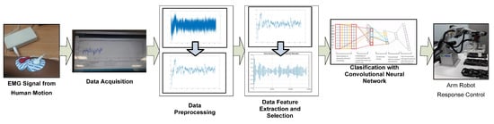 This section describes the method used for analyzing the human motion by the EMG signal and the method used as the human–robot interface. The human provides information about his/her intention in the collaboration and his/her hand activity to the robot, as shown by the EMG result. The EMG detects the human muscle activity with the path attached to the human hand. The data augmentation is used to increase the range of data without removing the data characteristics. Afterward, the continuous wavelet is used to transform the time domain to time–frequency domain and shows the power distribution for each signal. Finally, the result from the feature extraction is used as an input for the classification with a convolutional neural network (CNN) and the classification result directs the robot to perform specific actions. Figure 3 shows the scheme of the proposed method for analyzing the EMG data so that it may be used to inform the robot.