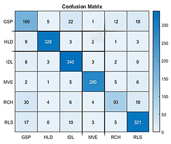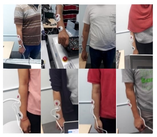 The first application of EMG in human–robot collaboration is for controlling robotic arm functions to perform an activity such as lifting based on the human hand activity []. Human hands are also used to control a wrist exoskeleton based on flexion, extension, ulnar deviation, and radial deviation []. Another application in the human–robot collaboration for lifting any object is based on human vertical directions (up, down, none) in movement gestures []. Attaching an EMG sensor to human muscles during a specific activity will provide information about any patterns. Information received from the EMG can be used to develop insights related to the kinds of human motions. The numerous hand activities that can be analyzed using EMG include closing, extension, flexion, finger straightening, grasping, pinching, and any pose [,,,]. For analyzing hand motions, two to six sensor channels are attached to the human hand. More channels attached to the human muscles will generate more muscle signals and will likely increase the accuracy of classification. However, the data collection process for analysis based on EMG, which requires attaching sensors, should not disturb the human or cause discomfort during the activity. Attaching as few sensors as possible to the human body is highly advisable to avoid interference with the human activity.