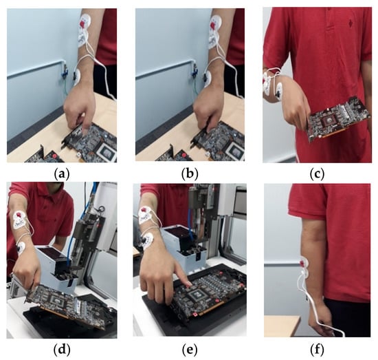 Eight volunteers (5 males and 3 females) participated in this analysis. The data collection process used a single-channel sensor to classify the human intention based on human flexor digitorum muscle activity, as shown in Figure 5. The data were obtained from six types of basic motions performed by the participants (Figure 6). The participants were asked to perform each motion for 2 s and to repeat each 40 times to simulate the tasks performed in a repetitive assembly job. From this data acquisition, 1920 data were collected, which resulted from 8 participants × 6 basic motions × 40 times replications.