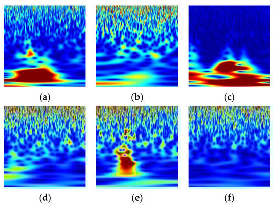 Continuous wavelet transform is used to produce the scalogram, which is used for short- and long-time localization and for low- and high-frequency localization [,]. Using the scalogram with the Morse feature as an input for a convolutional neural network’s training process can improve the validation accuracy []. The scalogram shows the square magnitude of the continuous wavelet transform, which is defined in Equation (1) [].